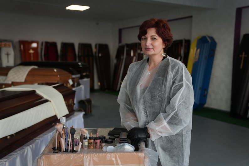 Василина Павлюк гримує тіла як удома в померлих, так і в приміщенні похоронного бюро. Його керівник Дмитро Тернівський каже, що про посмертний макіяж дізнався два роки тому за кордоном. У ритуальному бізнесі чоловік працює упродовж п’яти років і говорить, що культура цієї послуги в Україні починає зароджуватися.