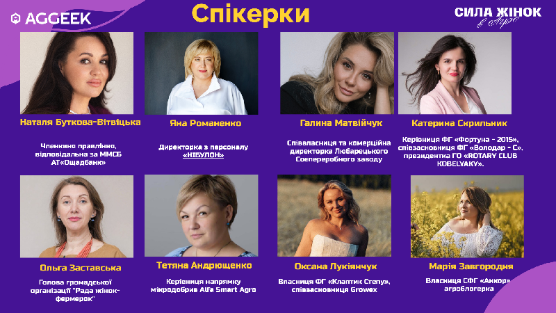 Конференція «Сила жінок в агро 2025» – це подія про нову реальність українського агро, організована агромедіа AGGEEK. У фокусі — жіноче лідерство, яке формує стратегії, запускає виробництва, впроваджує технології й розвиває партнерства. Конференція розрахована на власниць та керівниць агрокомпаній і господарств; виробниць крафтової продукції; топ-менеджерок заводів і трейдингових компаній; представниць банків, лізингових і страхових компаній; постачальників техніки, ЗЗР, насіння та інших ресурсів для агро; медіа та профільним асоціаціям.